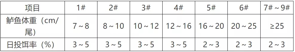 « 根據存池鲈魚規格及(ji)數(shu)量,參考投(tou)餌參考表中(zhong)推算投(tou)餌量,再根據天氣(qi)、水溫、水質(zhi)、鲈魚攝食及(ji)健康狀況等(deng)予以(yi)适當調整。